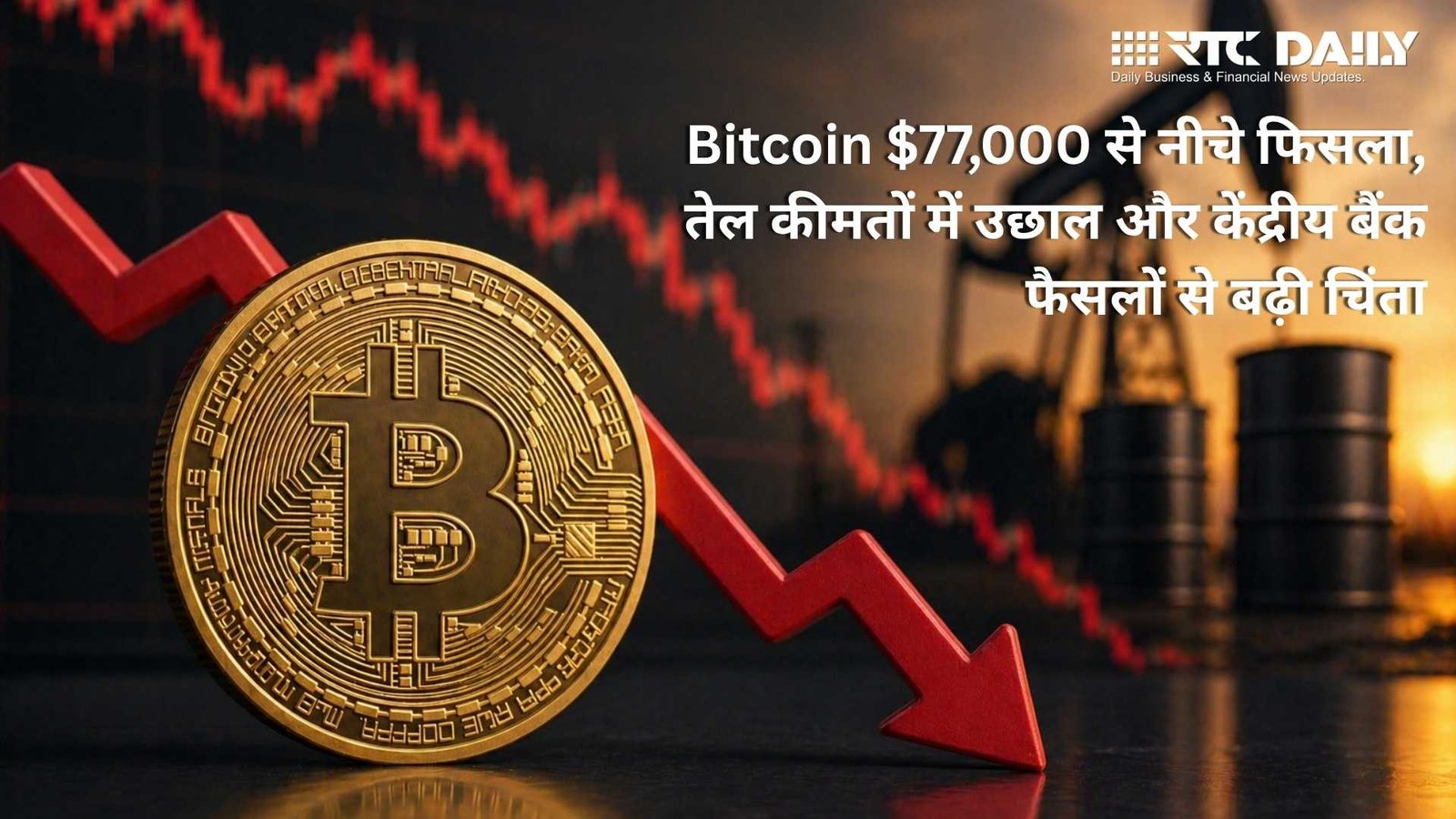 नई दिल्ली/न्यूयॉर्क: दुनिया की सबसे बड़ी क्रिप्टोकरेंसी Bitcoin एक बार फिर दबाव में आ गई है। मंगलवार के कारोबार में Bitcoin $77,000 के नीचे फिसल गया, क्योंकि कच्चे तेल की कीमतों में तेज उछाल और इस सप्ताह आने वाले बड़े केंद्रीय बैंक फैसलों ने निवेशकों की चिंता बढ़ा दी है। बाजार में risk-off sentiment के चलते क्रिप्टो बाजार में बिकवाली देखी गई।