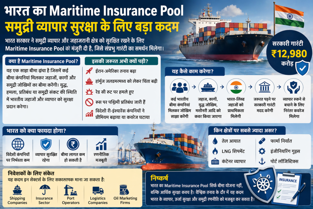 Maritime Insurance Pool ऐसा शेयर्ड इंश्योरेंस फ्रेमवर्क है जिसमें कई बीमा कंपनियां मिलकर जहाजों, कार्गो और समुद्री जोखिमों का बीमा करेंगी। यदि किसी क्षेत्र में युद्ध, हमला, प्रतिबंध या समुद्री संकट होता है, तो इस पूल के जरिए भारतीय जहाजों और व्यापार को सुरक्षा मिलेगी।