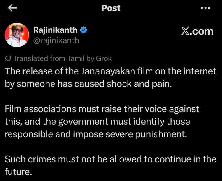 साउथ सिनेमा की बहुप्रतीक्षित फिल्म ‘जना नायकन’ के ऑनलाइन लीक होने के बाद पूरे फिल्म इंडस्ट्री में हड़कंप मच गया है। दिग्गज कलाकार Rajinikanth और Kamal Haasan ने इस घटना की कड़ी निंदा करते हुए इसे “सिस्टम की विफलता” बताया है। रजनीकांत ने दोषियों के खिलाफ सख्त कार्रवाई की मांग की, वहीं कमल हासन ने इसे फिल्म सर्टिफिकेशन प्रक्रिया में देरी और खामियों का नतीजा बताया।