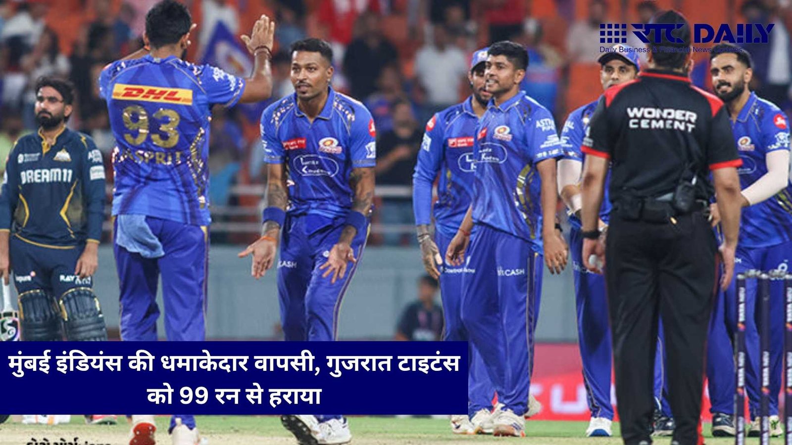 IPL 2026 के 30वें मुकाबले में आखिरकार मुंबई इंडियंस ने जीत का स्वाद चख लिया। अहमदाबाद के नरेंद्र मोदी स्टेडियम में खेले गए इस मुकाबले में मुंबई इंडियंस ने गुजरात टाइटंस को 99 रन के बड़े अंतर से हराकर मौजूदा सीजन की सबसे बड़ी जीत अपने नाम कर ली।
