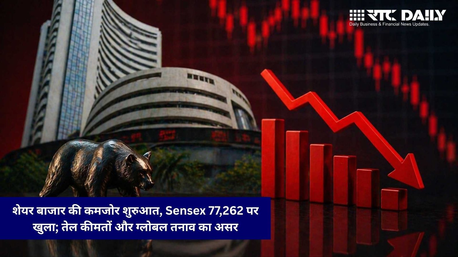 मुंबई: भारतीय शेयर बाजार ने आज कमजोर शुरुआत की। कारोबार शुरू होते ही BSE Sensex 77,262 अंकों के आसपास खुला, जबकि Nifty 50 भी दबाव में नजर आया। वैश्विक बाजारों से मिले कमजोर संकेत, कच्चे तेल की बढ़ती कीमतें और भू-राजनीतिक तनाव ने निवेशकों की धारणा पर असर डाला।